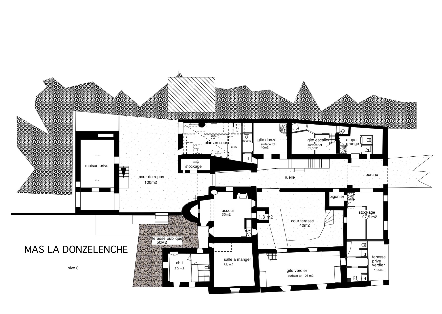 Le domaine s'étend sur environ 10 hectares et comprend un magnifique Mas du XVIe siècle rénové avec gout. Un hameau isolé et plein de charme avec des portes, des cours intérieures, un pigeonnier, un four à pain, etc. Trois gîtes confortables et bien équipés (2, 4 et 8p) y ont été aménagés, où l'on peut séjourner en toute autonomie si on le souhaite. Il y a également un gîte d'étape avec 3 dortoirs formule budget (2, 3, 5p) avec des sanitaires communs, ainsi que 4 chambres sophistiqué et tout confort (2, 3, 4, 5p), chacune avec ses sanitaires ; une salle à manger pouvant accueillir environ 25 personnes; et un espace d'accueil dans la magnifique ancienne cuisine authentique datant de 1590. En été, une cour offre le cadre charmant pour la table d'hôte (±25 places) ; et dans l'autre cour se trouve une terrasse agréable avec barbecue. Une machine à laver est à la disposition des hôtes et une pièce séparée avec 2 machines à laver est réservée au linge de l'établissement. Diverses terrasses et coins salon ont également été aménagés à l'intérieur et autour du Mas.